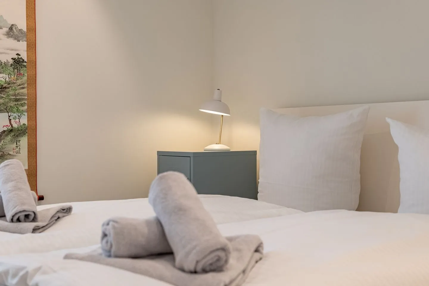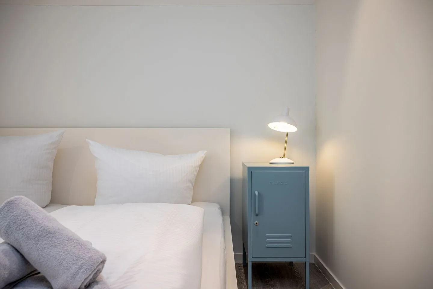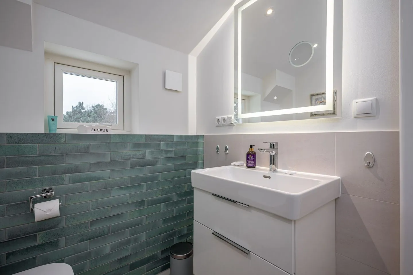Das Obergeschoss ist bewusst als privater Rückzugsbereich konzipiert. Hier befindet sich ein stilvolles Schlafzimmer mit Doppelbett sowie ein modernes Badezimmer mit Dusche. Ergänzt wird das Raumangebot im Außenbereich durch ein separates Gäste-WC – praktisch und diskret zugleich. Am hinteren Hauseingang befindet sich ein Waschtrockner, so dass Sie auch für längere Aufenthalte perfekt gewappnet sind.