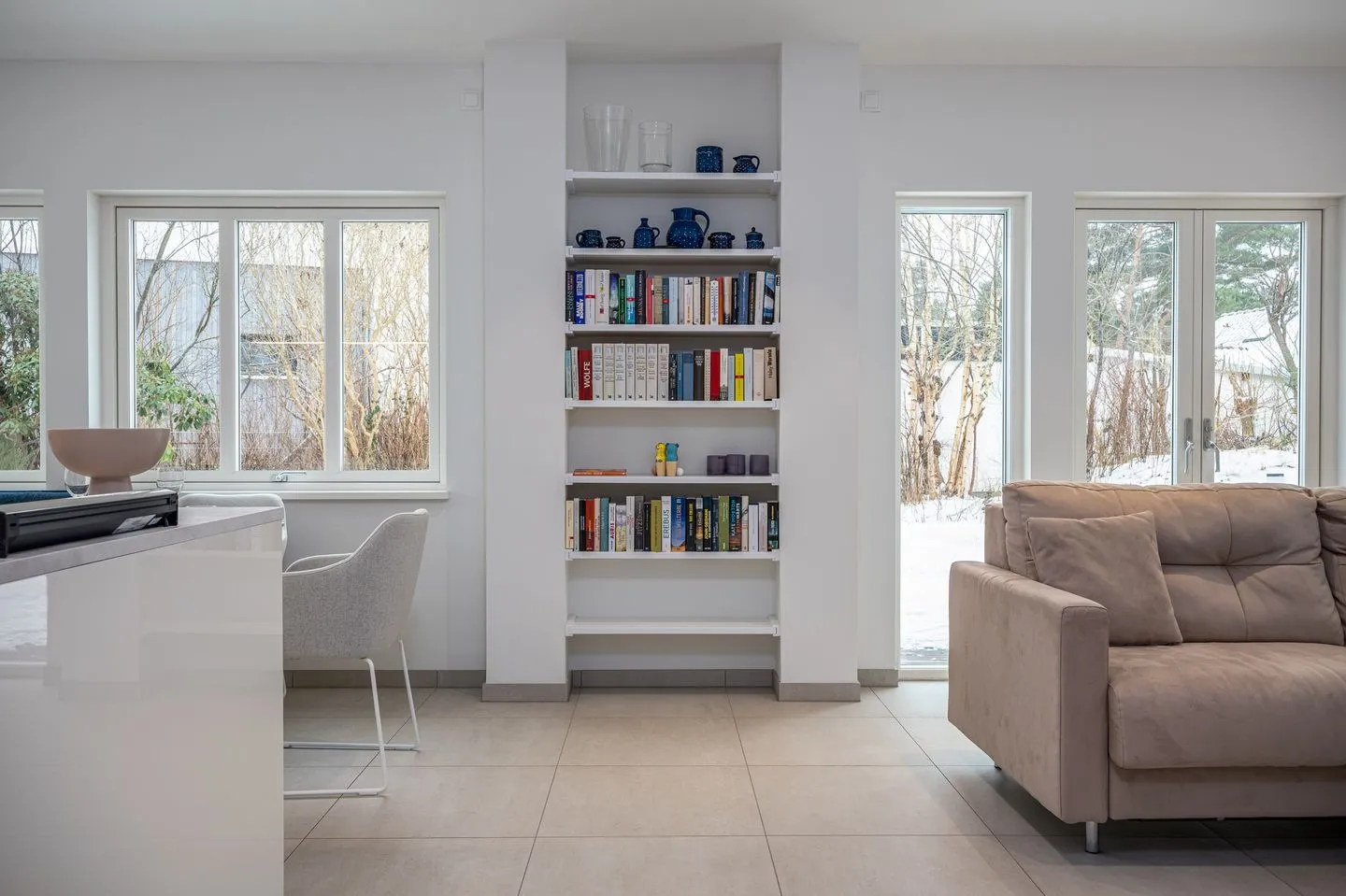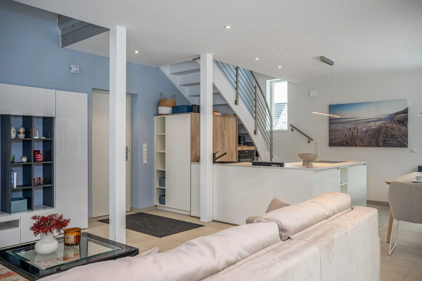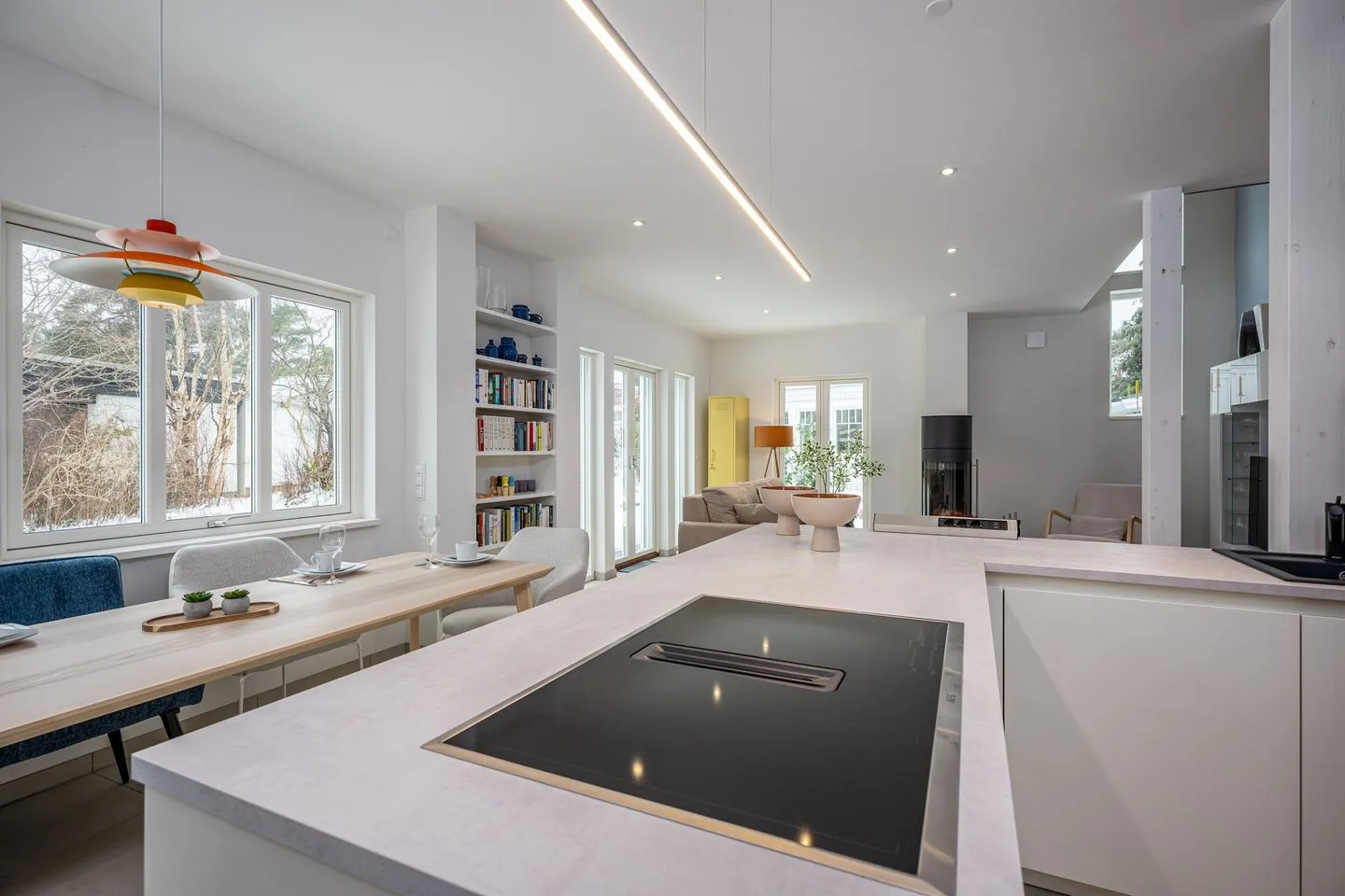 Im Erdgeschoss empfängt Sie ein großzügig gestalteter, offener Wohn- und Essbereich. Die hochwertige, offene Küche fügt sich harmonisch in den Raum ein und bietet ideale Voraussetzungen für genussvolle Abende. Der Wohnbereich mit großem Kamin bildet das Herzstück des Hauses und lädt – ergänzt durch eine gemütliche Leseecke – zu entspannten Stunden bei knisterndem Feuer ein. Große Fenster sorgen für viel Licht und schaffen eine warme, ruhige Atmosphäre.