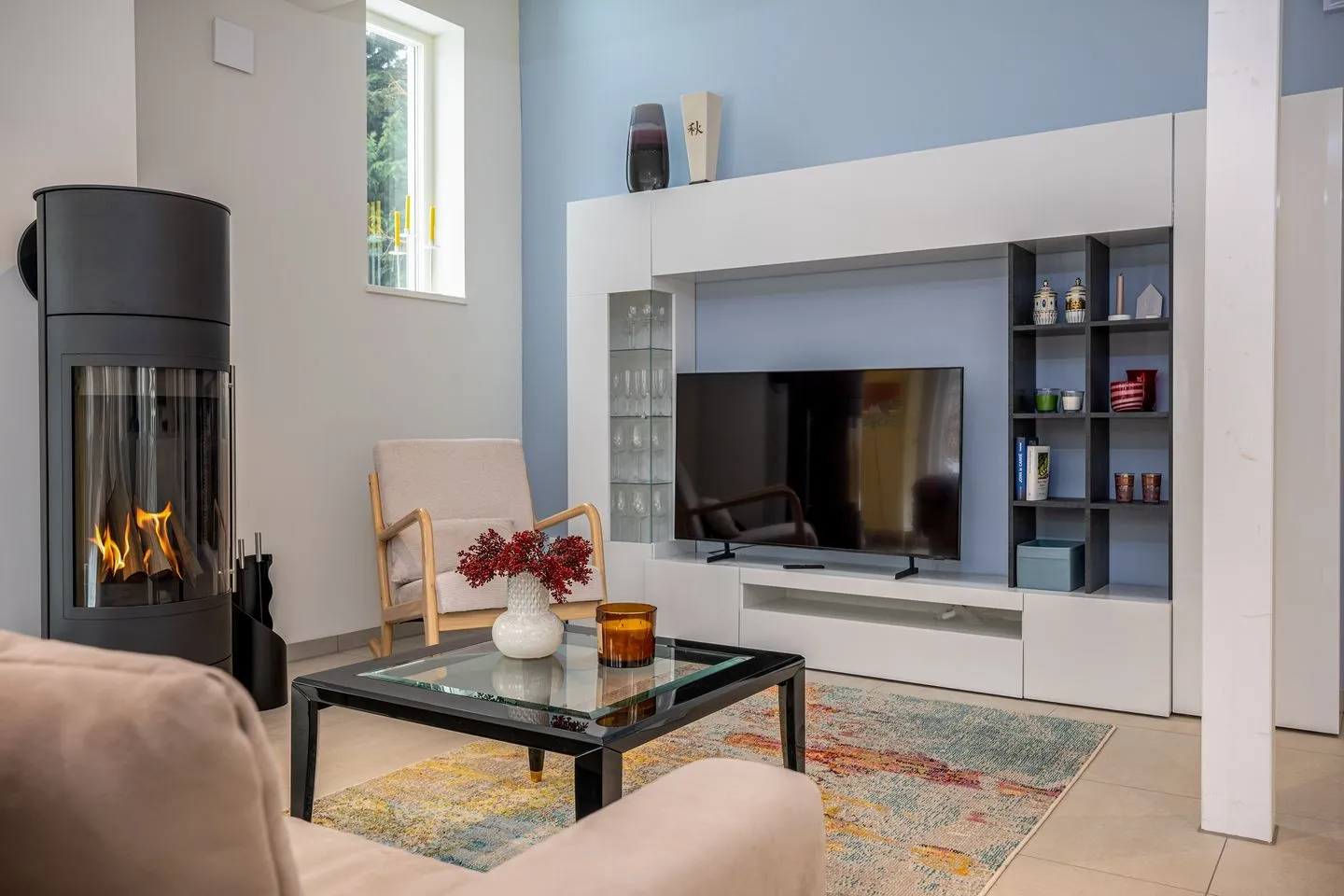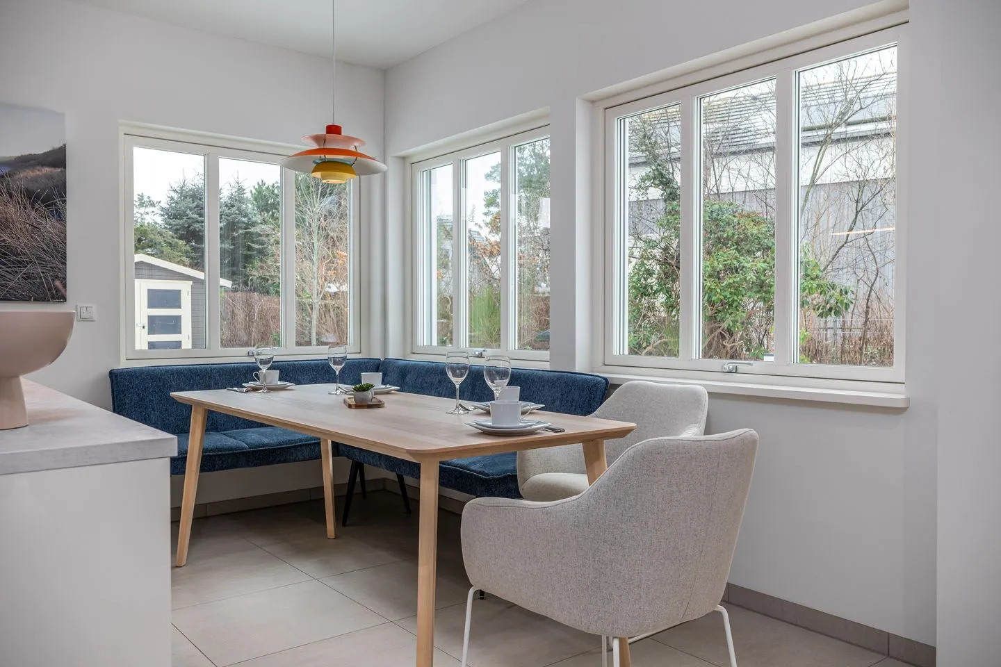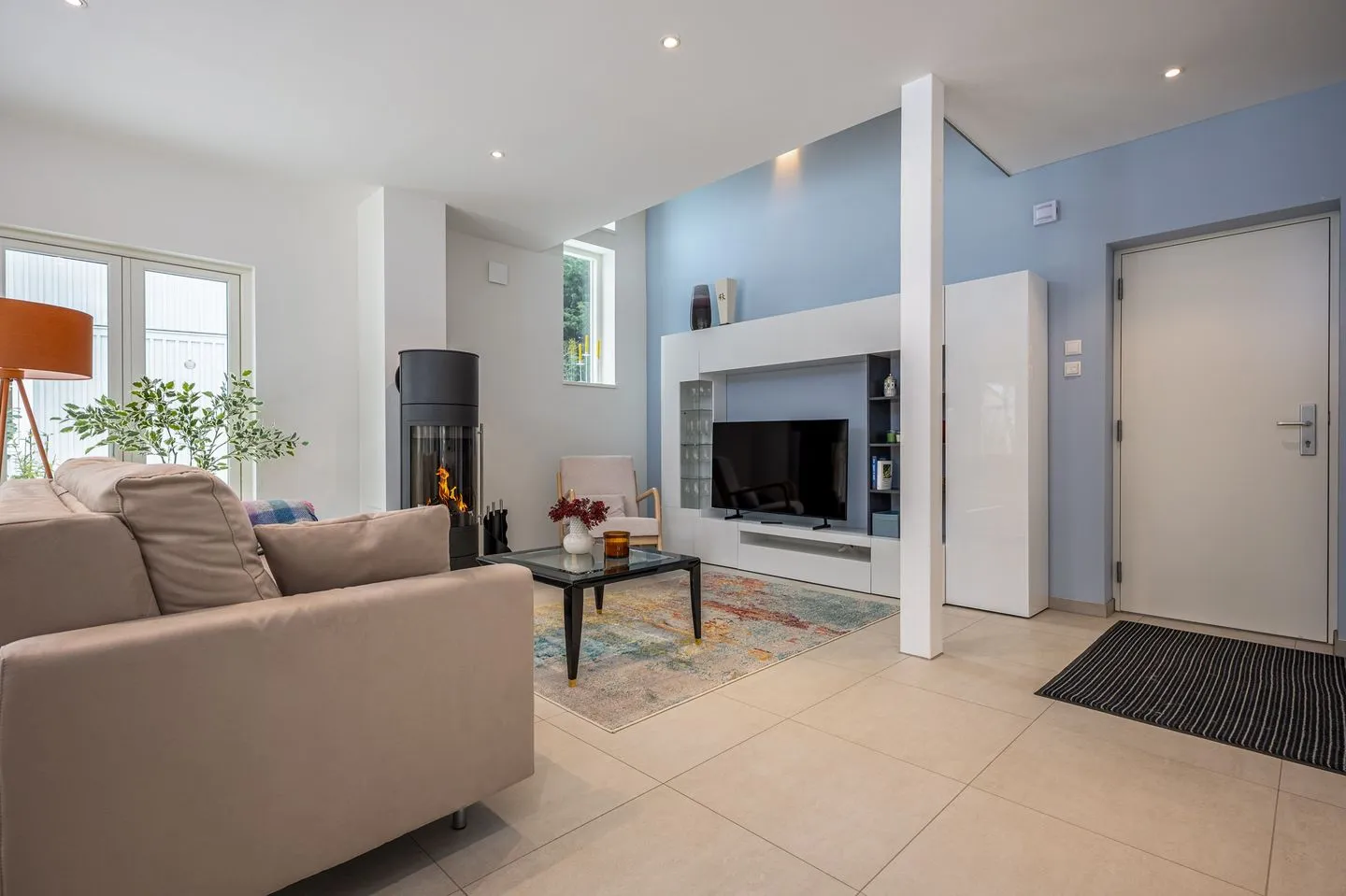 Im Erdgeschoss empfängt Sie ein großzügig gestalteter, offener Wohn- und Essbereich. Die hochwertige, offene Küche fügt sich harmonisch in den Raum ein und bietet ideale Voraussetzungen für genussvolle Abende. Der Wohnbereich mit großem Kamin bildet das Herzstück des Hauses und lädt – ergänzt durch eine gemütliche Leseecke – zu entspannten Stunden bei knisterndem Feuer ein. Große Fenster sorgen für viel Licht und schaffen eine warme, ruhige Atmosphäre.