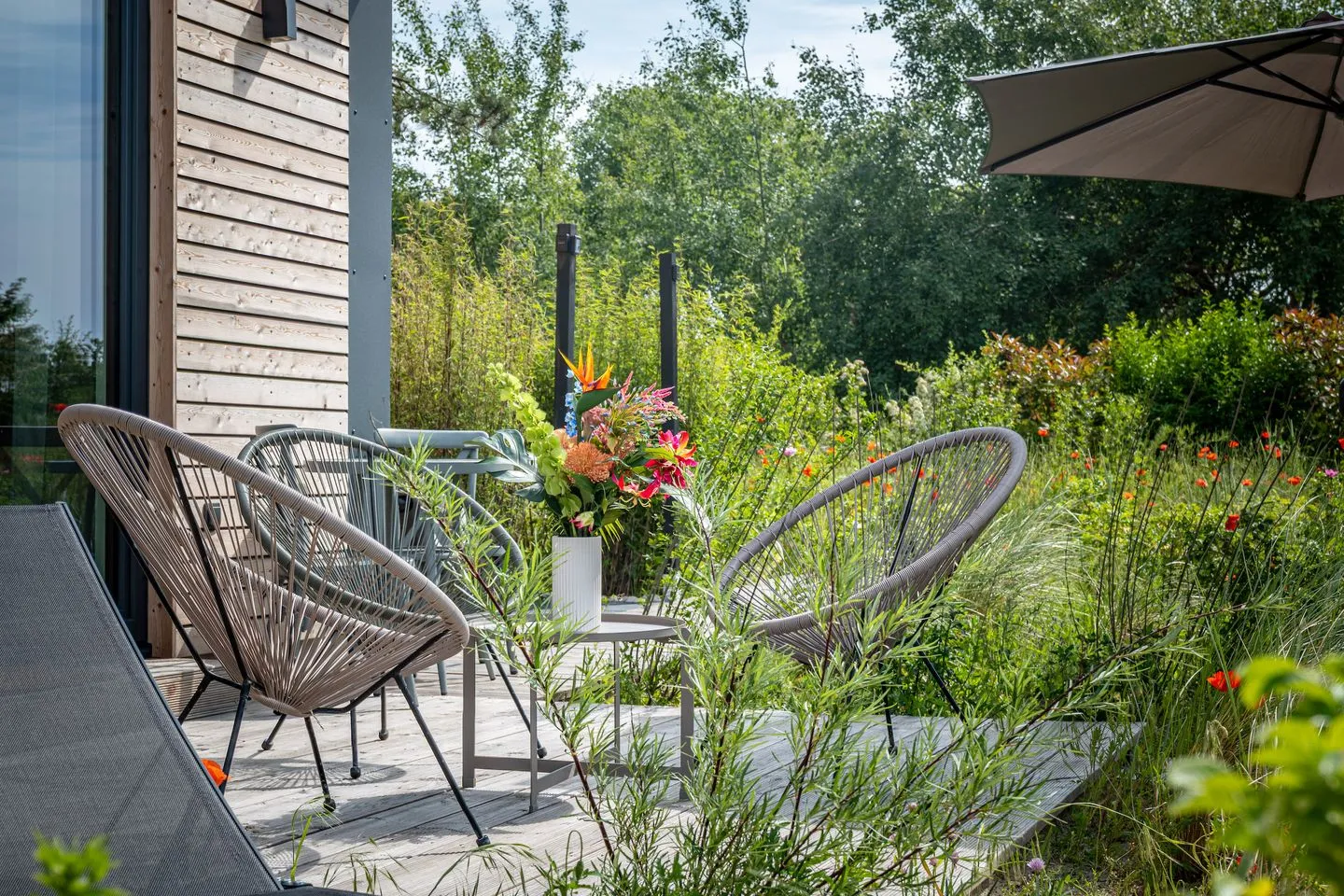 Letztere teilen sich auf in ein Zimmer mit zwei Einzelbetten und ein Doppelschlafzimmer. Sollten Sie keinen klassischen Urlaub, sondern eine Workation planen, stehen Ihnen in beiden Räumen je ein kleiner Arbeitsplatz zur Verfügung, an den Sie sich zurückziehen können. Stauraum für Ihre Kleidung sowie je ein Smart-TV sind ebenfalls vorhanden. Bodentiefe Fenster führen von beiden Schlafzimmern zum schönen Garten hinaus, welcher mit hochwertigem Mobiliar ausgestattet ist. Hier dürfen Sie den morgendlichen Kaffee direkt mit einem Blick ins Ostsee typische Schilf genießen. Durch dieses ist das Gartengrundstück gleichzeitig dünenhaft und geht damit nahtlos in die "wahre" Düne über.