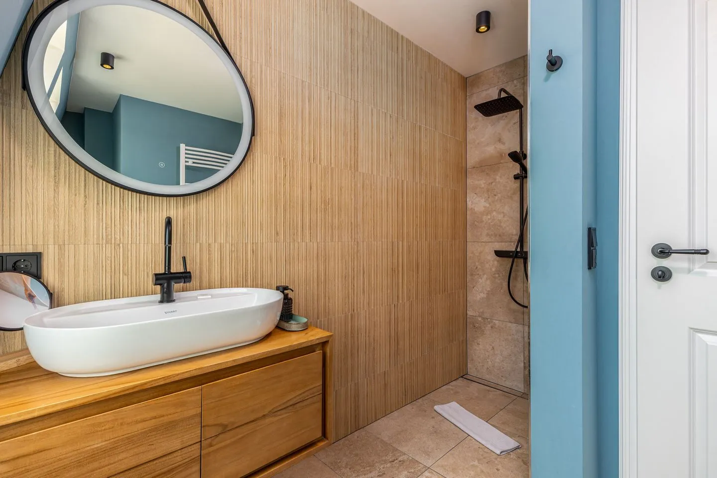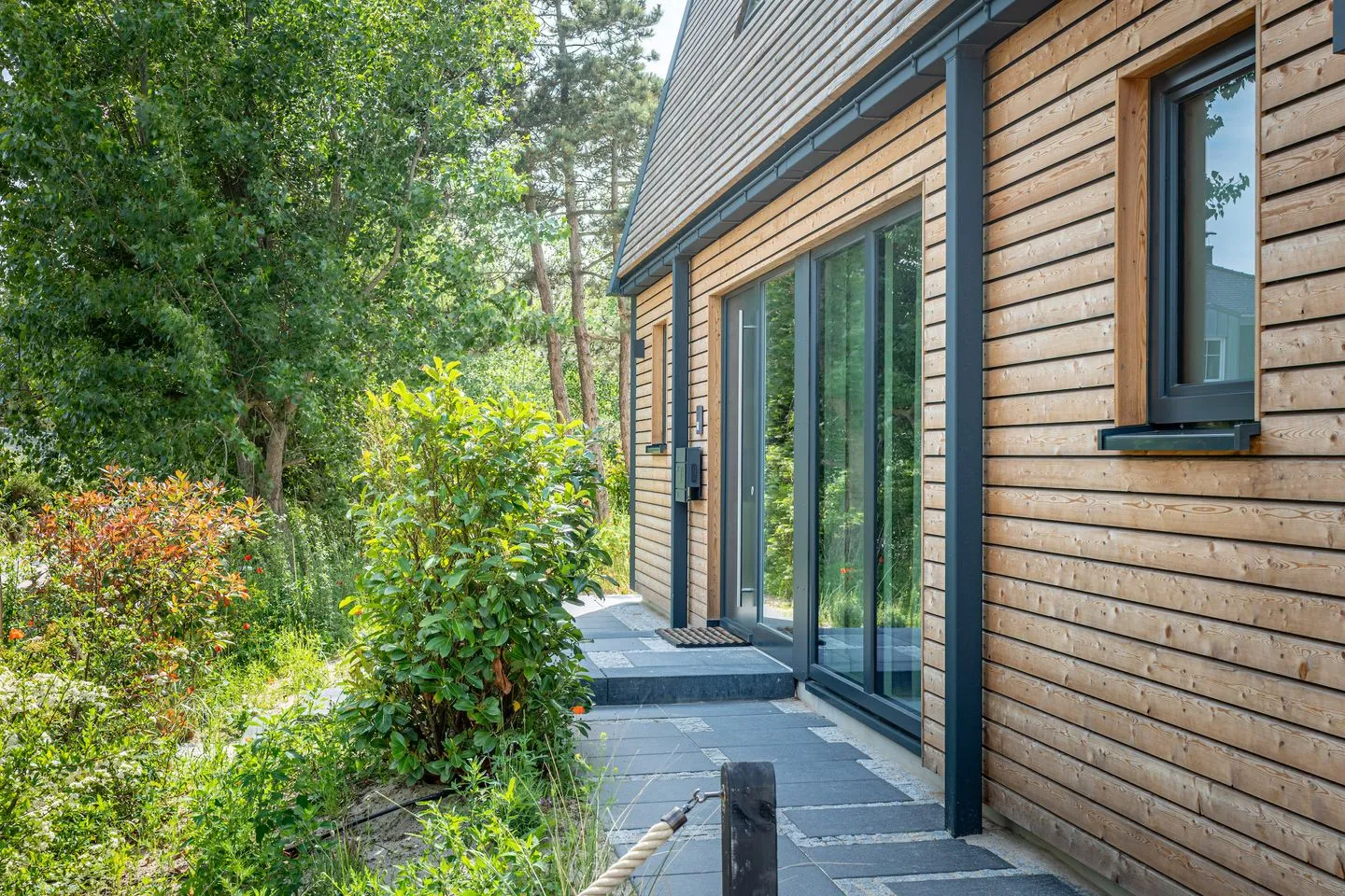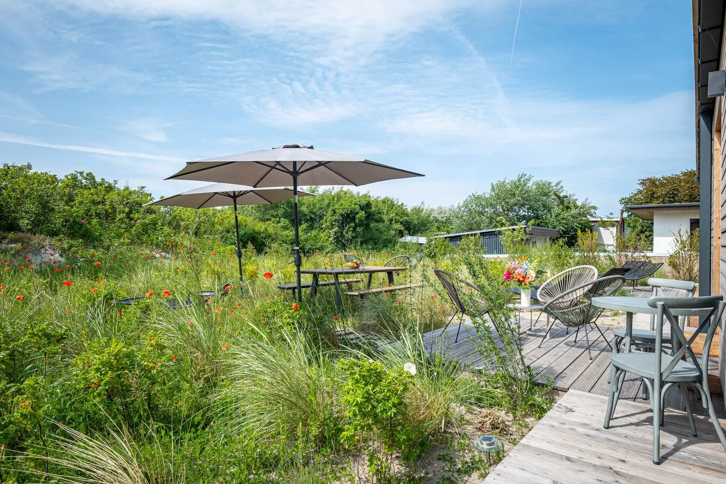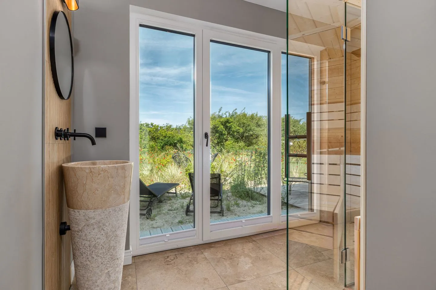 Das Spa im Erdgeschoss bestehend aus Sauna, ebenerdiger Dusche und Waschbecken, hat, wie die beiden Schlafzimmer, ebenfalls einen Zugang zur Terrasse. Sogar aus der Sauna heraus kann der wunderbare Blick in die Dünen genossen werden.