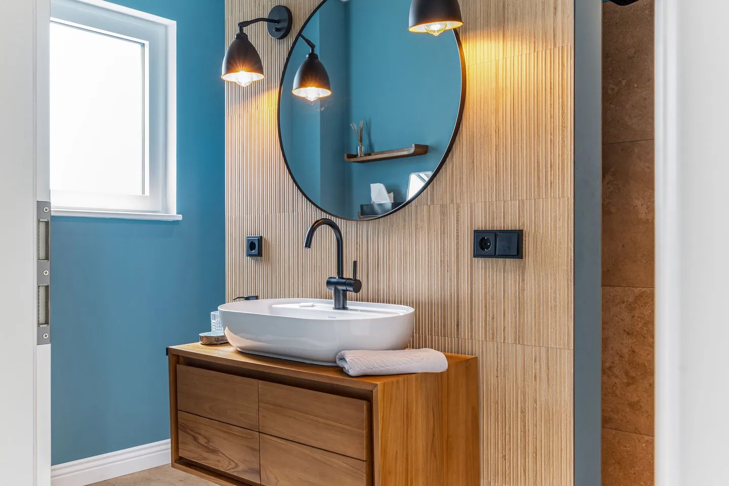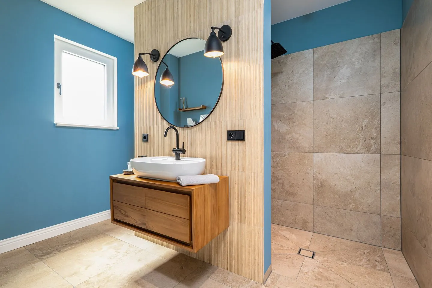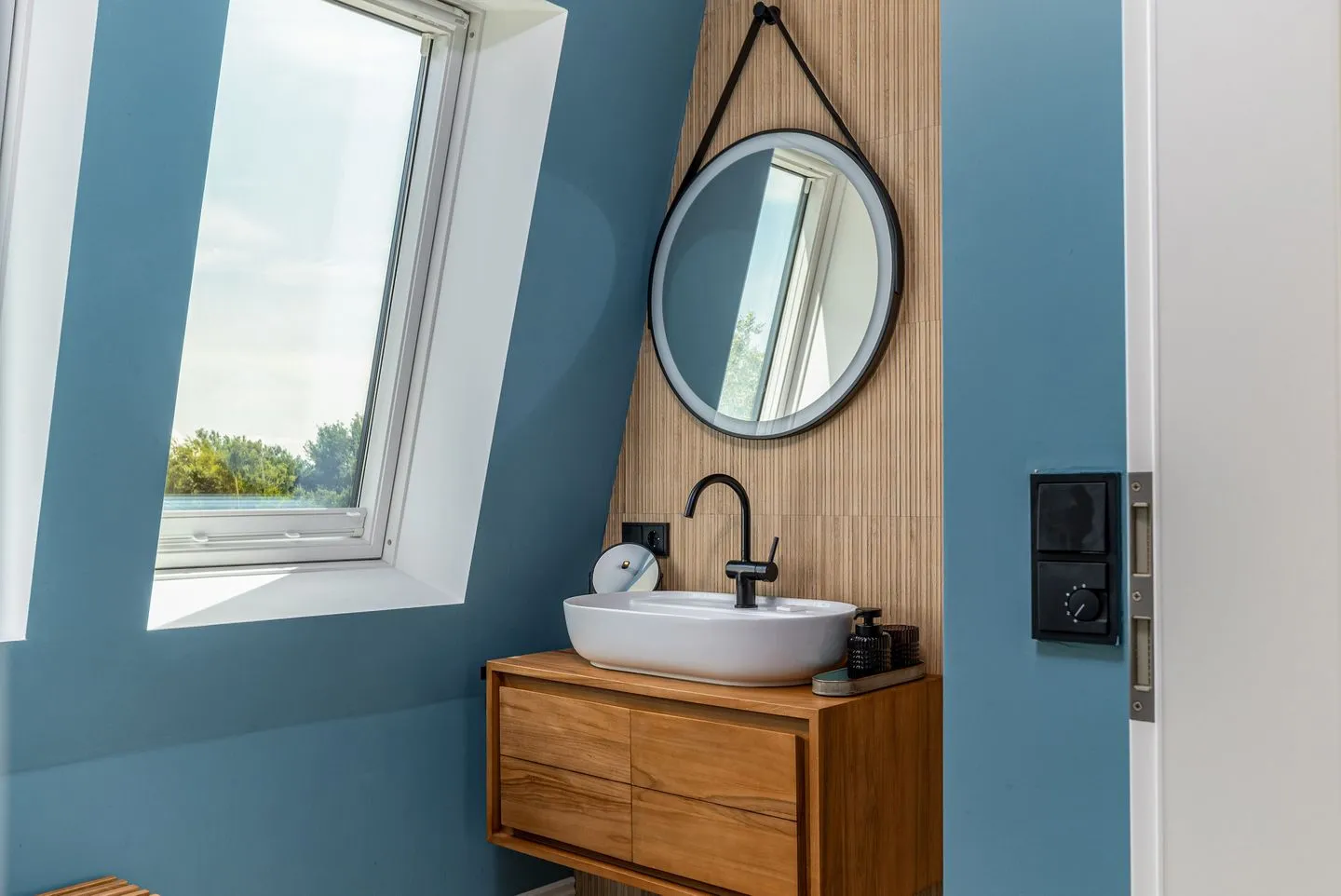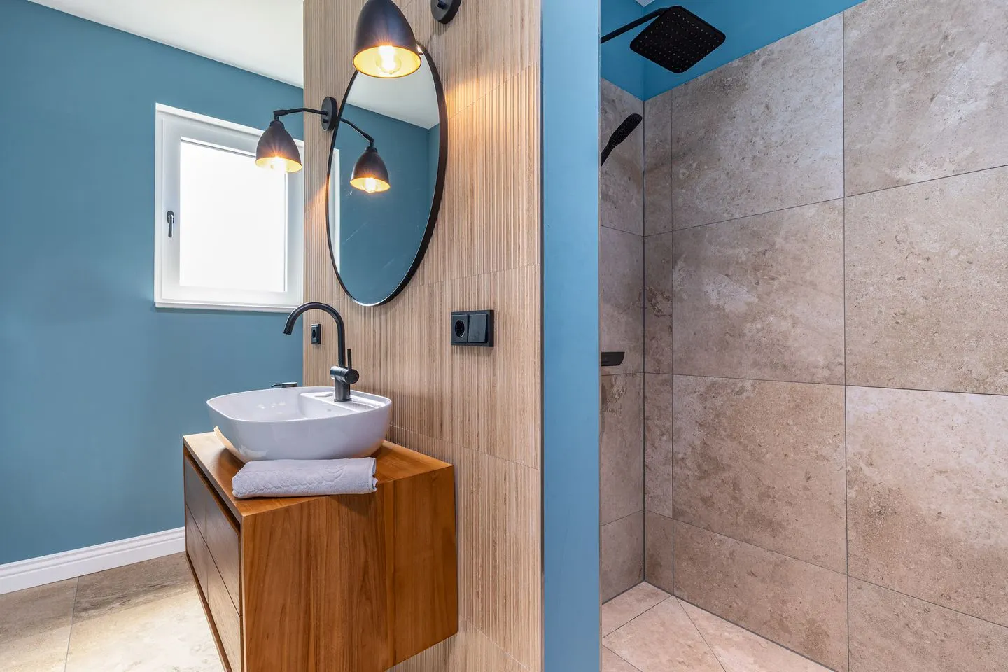 Das Spa im Erdgeschoss bestehend aus Sauna, ebenerdiger Dusche und Waschbecken, hat, wie die beiden Schlafzimmer, ebenfalls einen Zugang zur Terrasse. Sogar aus der Sauna heraus kann der wunderbare Blick in die Dünen genossen werden.