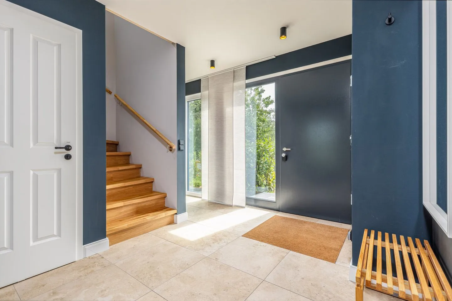 Der Eingang im Erdgeschoss ist vom PKW-Stellplatz, der zusätzlich mit einer E-Ladesäule ausgestattet ist, gut erreichbar. Im Flur erwartet Sie ein großzügiger Eingangsbereich, von dem aus Sie sowohl das Badezimmer mit Dusche, die Sauna, den Hauswirtschaftsraum mit Miele Waschtrockner als auch die beiden im Erdgeschoss liegenden Schlafzimmer erreichen.