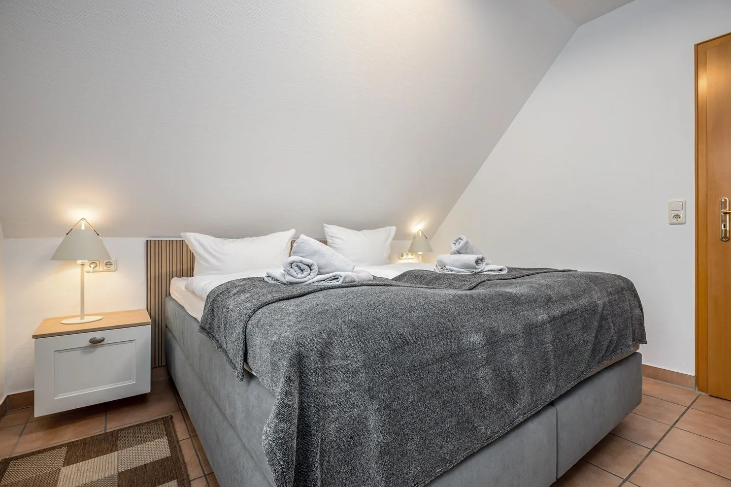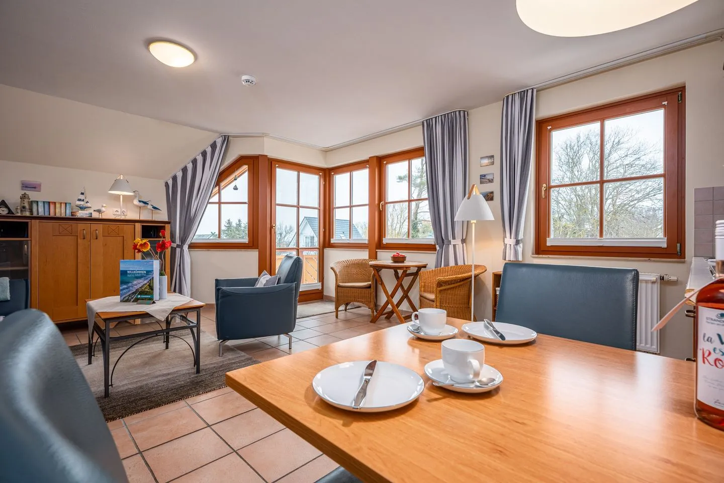 Kaum 150 Meter vom Strand entfernt liegt die Appartmentanlage OEWERN DIEK, zu der diese schöne Obergeschoss-Wohnung gehört. Durch den Einsatz von Holz und farbigen Textilien wird hier eine besonders gemütliche Atmosphäre geschaffen.