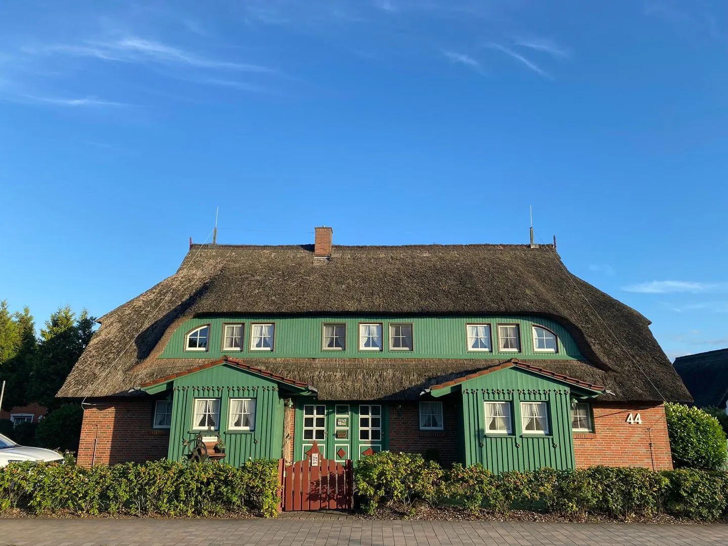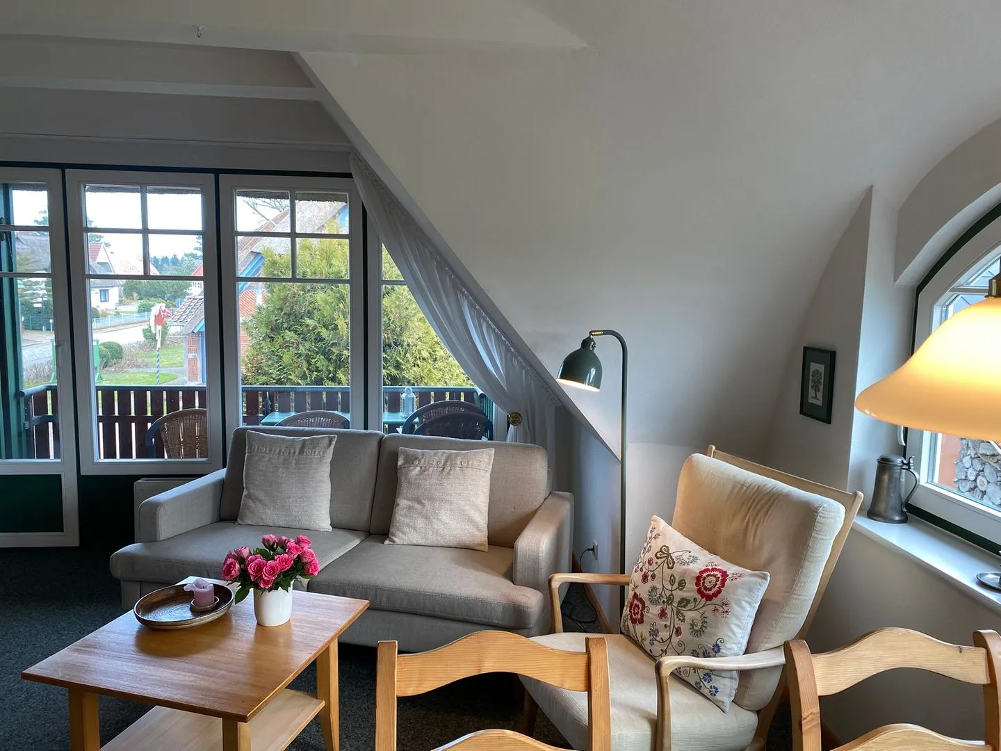 In diesem charmanten, reetgedeckten Haus erwartet Sie eine großzügige Maisonette-Wohnung, die auf zwei Ebenen ein wunderbar luftiges Wohngefühl bietet. Das Herzstück bildet der helle Wohnbereich: Eine weitläufige Fensterfront lässt das Tageslicht hereinströmen und eröffnet eine sanfte Aussicht auf die ruhige Natur rund um den Bodden. Egal ob beim Frühstück, beim Lesen oder beim entspannten Zusammensitzen – hier fühlt sich jeder Moment ein wenig nach Urlaub an.